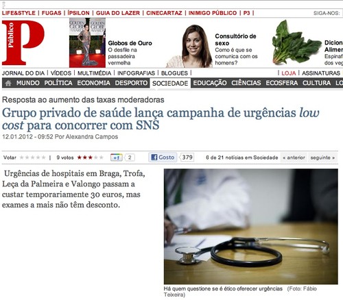 Agora o que eu sei, é que este novo "coelho tirado da cartola" - as urgências low cost a 30 euros cada - é um autêntico embuste e deveria ser investigado pela ERS e pela ARS-Norte. Isso eu sei. E até posso dar um exemplo concreto de um jovem com um certo grau de deficiência e que por isso mesmo, sofre frequentes quedas, que lá foi levado pela mãe com o engodo do custo anunciado - que foi cumprido - mas que depois de somados os consumíveis e os extras todos, sendo que o ferimento (na cabeça) era um corte ligeiro que apenas exigiu uma sutura com duas ou três tiras de steri-STRIP, totalizou 98 euros!