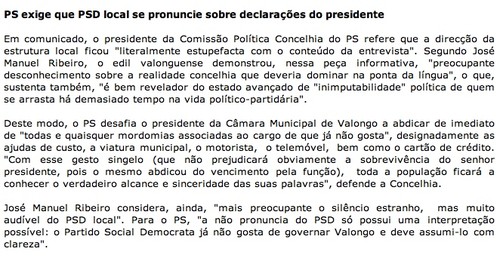 É absolutamente extraordinário, que as estruturas concelhias do PSD e do aliado CDS-PP, ainda não se tenham pronunciado sobre esta verdadeira falta de respeito para com os eleitores valonguenses. Ou será que também os referidos Partidos já não gostam de governar Valongo? Eé que se for assim, é preferível extrair todas as consequências que resultam da lei, do que levar até ao fim um mandato onde quem lidera não é quem deve e quem deve já não lidera - porque "ligado à máquina" ninguém consegue tomar decisões.