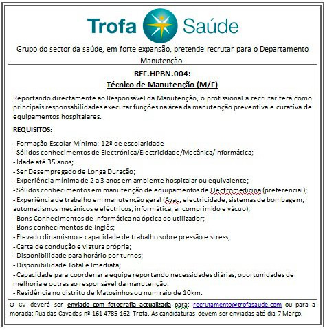 O grupo Trofa Saúde e Hospital Privado de Alfena, contratam um técnico e manutenção M/F <35 anos desempregado de longa duração.