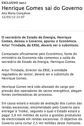 Já sabíamos que era assim e por isso esta notícia da demissão do secretário de Estado da Energia não nos espantou por aí além - sobretudo depois de ter tido a coragem de dizer o óbvio e que um estudo credível e independente confirmou: que andávamos a pagar a factura da energia que consumíamos acrescida das alcavalas e dos roubos transformados em lei que lhe vêem acoplados.