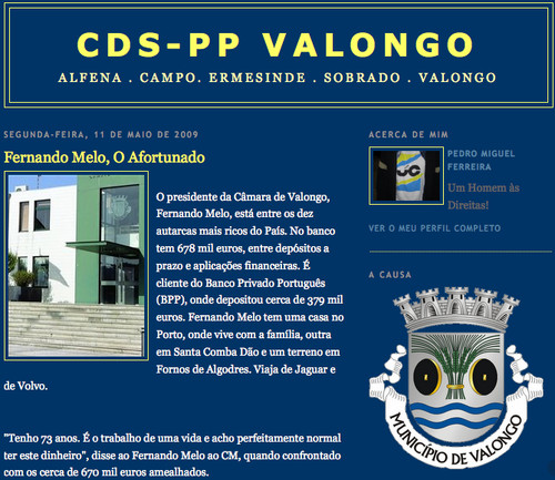 Já depois de ter fechado e edição e publicação do último post sobre Fernando Melo, formalmente (ainda) presidente da Câmara de Valongo e ao reler este post publicado na página do CDS-PP de Valongo em 11 de Maio de 2009, ao qual já fiz referência numa outra altura - para quem não se lembre o CDS-PP é (ainda) o actual parceiro do PSD na coligação que sustenta a Câmara e a Assembleia Municipal - deparei com o pequeno detalhe do texto que se segue: