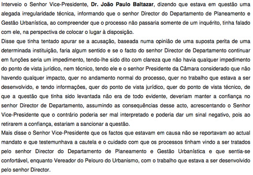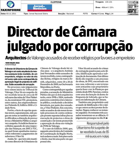 Repesco aqui a notícia do JN sobre o processo e também o recorte da referida acta onde o executivo tenta desvalorizar o assunto e Fernando Melo (testemunha abonatória de Vítor Sá) diz que tudo indica que o arquitecto seja absolvido.