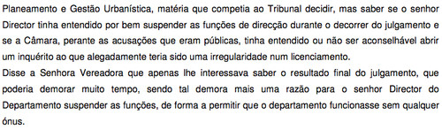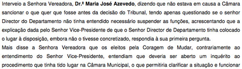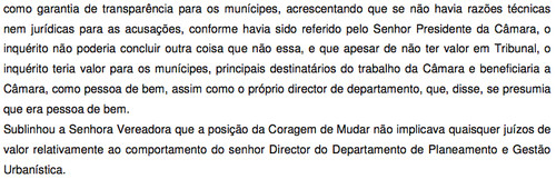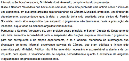 Porém não foi - 'embora deva ser considerado inocente até trânsito em julgado de eventual sentença condenatória' - e se o desconforto da oposição, manifestado pela voz de Maria José Azevedo em 17 de Novembro já se justificava, agora deve passar da fase do desconforto à exigência - digo eu, que não tenho voto na matéria mas não abdico do direito a ter a minha opinião e a expressá-la de forma livre - no sentido de que a Câmara se pronuncie novamente sobre o assunto, com base neste novo desenvolvimento.