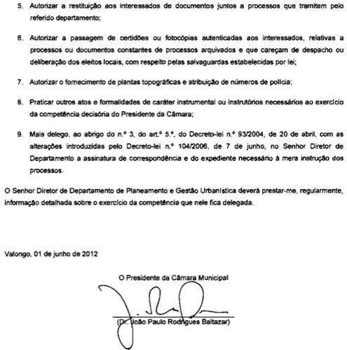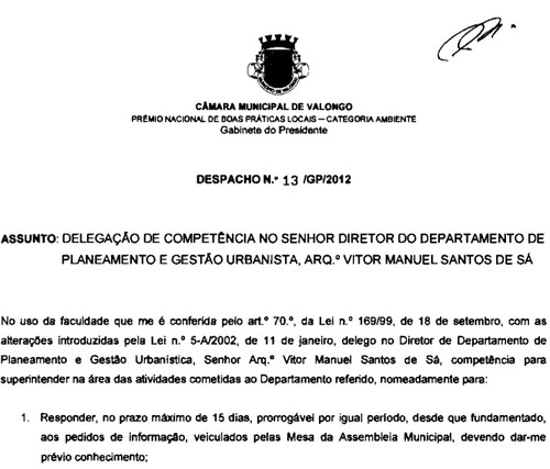Agora o que me deixa verdadeiramente de boca aberta de de espanto e acredito que também à maioria dos valonguenses, é a delegação de poderes no Director de Departamento de Planeamento e Gestão Urbanística, o arq. Vítor Sá!