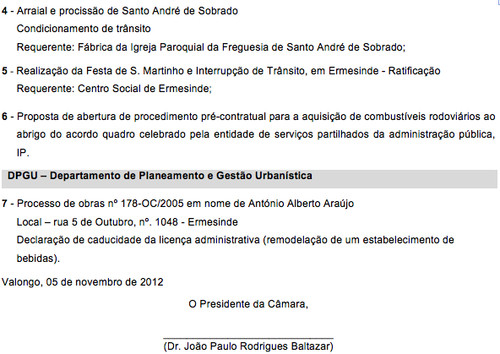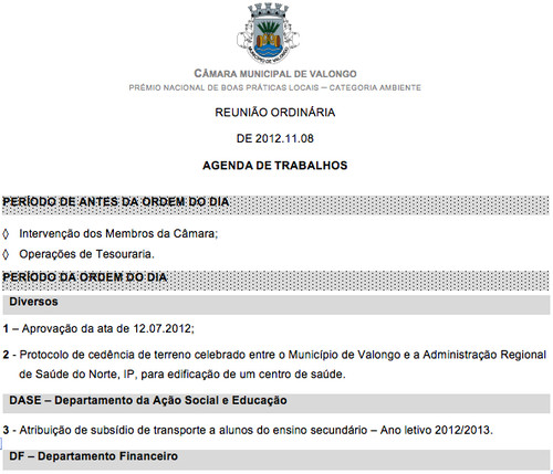 Eis então a 'extensíssima' Ordem de Trabalhos para a reunião de quinta feira, dia 8 de Novembro de 2012 pelas 10 horas: