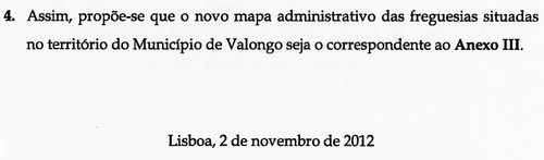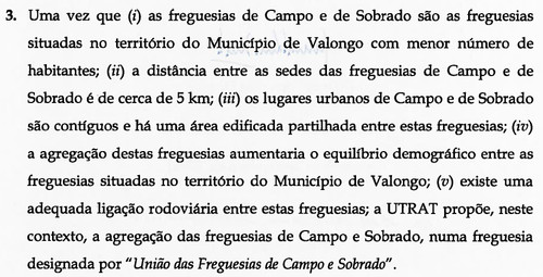 "Que não, que ele saberia separar as duas posições e que na altura da aprovação da proposta relativa a Valongo, ele seguramente nem participaria na votação" - atalharam logo os membros da coligação, uns com mais convicção que outros, notando-se mesmo algum incómodo por parte de alguns deputados do Grupo Municipal do PSD, por se verem obrigados a defender o voto contra essa moção. Foi visivelmente 'gaguejante' que a líder do grupo laranja teve de dar a cara para definir o sentido de voto. E afinal, tinha razões para 'gaguejar' uma vez que o Eng.º Campos Cunha participou na decisão, votou e assinou a proposta de agregação das Freguesias de Campo e Sobrado - e com uma fundamentação bem interessante (?) como se pode constatar pelos recortes abaixo.