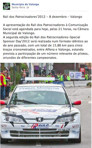 Correndo o risco de ser politicamente incorrecto, sujeitando-me às críticas de alguns amigos mais 'aferroados' por este tipo de desporto - e aqui me confesso que eu próprio também o aprecio - quero falar do próximo Rali dos Patrocinadores anunciado na passada 6ª feira na Câmara Municipal.
