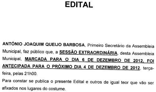 Assembleia Municipal extraordinária, marcada para 6 de Dezembro, foi antecipada para o dia 4, terça feira, no mesmo local e à mesma hora - Salão Nobre da Câmara.