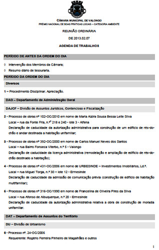 A seguir e em recorte, coloco a respectiva Ordem de Trabalhos: