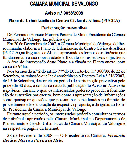 Ainda o PUCCA - e para que a memória sobre a falta de seriedade dos nossos autarcas relativamente às promessas que fazem, apenas para arrecadar votos e nunca com a intenção de as cumprir não passem ao rol do esquecimento - dois recortes do Diário da República - AQUI