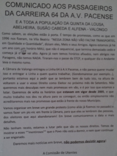 (As minhas desculpas pela má qualidade da foto. Se alguém me quiser enviar o texto original - afixado em várias paragens - eu agradeço desde já).