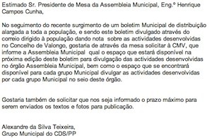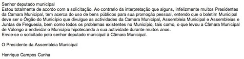 Dois recortes que explicam melhor o que acabo de dizer - um do líder do Grupo Municipal do CDS/PP, eng.º Alexandre Teixeira e o outro, referindo a resposta do presidente da Assembleia Municipal, eng.º Campos Cunha: