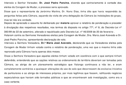 - Em 16 de Fevereiro de 2012, foi aprovado em reunião de Câmara (ver recorte abaixo) o Relatório de Ponderação da Alteração Pontual ao PDM, com os votos contra dos vereadores eleitos pela Coragem de Mudar.