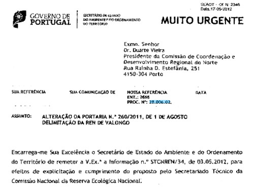 - Em 17 de Maio de 2012, a SEAOT/DGOTDU, remeteram à CCDR-N a pedido desta entidade, (recortes a seguir) um exaustivo documento que em síntese, considera o pedido de alteração pontual com vistas à construção de uma plataforma logística da Jerónimo Martins em Alfena, intrínsecamente ligado à aprovação final do PDM.
