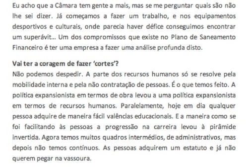 Dizer-se que com menos chefias a Câmara é ingovernável, é passar um atestado de menoridade a muitas dezenas de presidentes de Câmara de dimensão semelhante à da nossa, já para não falar na inevitável comparação que se poderia fazer com empresas de vanguarda no sector privado.