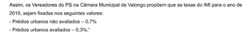 Sobre o IMI foi decidido na reunião de Câmara de 17 de Novembro de 2009 (informação a seguir) e por proposta dos vereadores eleitos pela Coragem de Mudar, que a taxa para 2010 se situaria nos 0,36%.