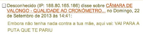 Não querendo acusar ninguém sem provas, o comentário ofensivo que deu azo à queixa hoje apresentada na GNR de Alfena e reproduzida abaixo, pelo conteúdo bem específico remete-me necessariamente para um grupo muito restrito de possíveis criminosos.