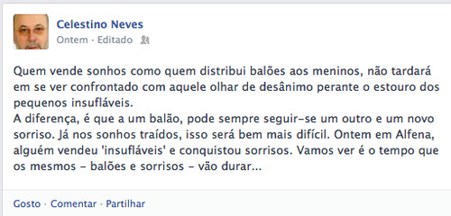 Paulatinamente, virei aqui fazer o balanço dos insufláveis ainda a planar, mas sinceramente, tenho o pressentimento de que chegaremos a 2017 da mesma forma que chegamos a 2009 e que basicamente foi a mesma como aportamos a 2013, isto é, a testemunhar o ar de desânimo nos rostos dos alfenenses, que mesmo assim arriscaram uma vez mais um ténue voto de confiança - como quem diz para se convencer a si próprio "à terceira será de vez".