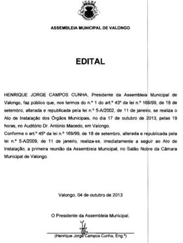 No próximo dia 17 de Outubro terá lugar no Auditório Dr. António Macedo - espaço comercial ao lado da Câmara - a instalação do Órgão Assembleia Municipal do nosso Concelho (ver recorte abaixo)
