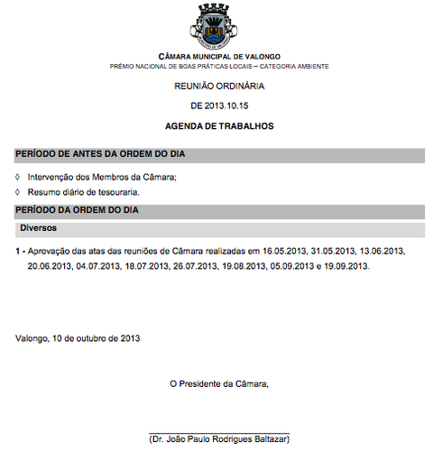 Próximo dia 15 de Outubro, terça feira, pelas 10:00 horas, reunião pública de Câmara.