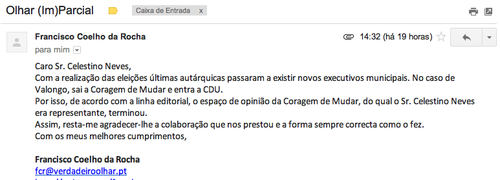 O email que enviei a este senhor era pessoal, tendo como objectivo informa-lo disto mesmo e agradecer-lhe a colaboração prestada até aqui. Fazer outra leitura que não seja esta é pura má-fé."