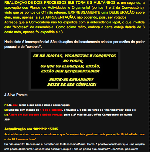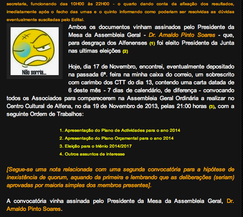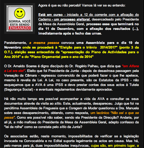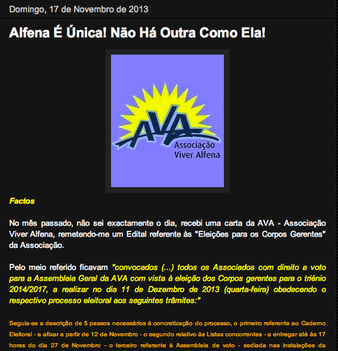 Partilho o relevante conteúdo que se segue, publicado pelo excelente Blog Alfena da Liberdade e relacionado com a AVA-Associação Viver Alfena, uma IPSS que sempre foi uma espécie de 'sucursal' da Junta de Freguesia e que (talvez) por isso mesmo, padece dos mesmos achaques que desde 2005 vimos registando e denunciando em relação a este Órgão: Falta de transparência, opacidade, desolador amadorismo na sua gestão.