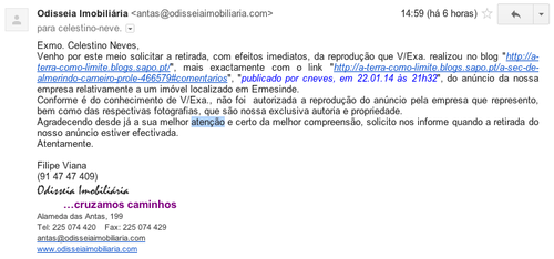 Em resultado desse incómodo, recebi hoje um e-mail da imobiliária a pedir que retirasse as referidas fotos - ver recorte a seguir - e como não quero acrescentar problemas a uma empresa que como muitas outras já os terá em número suficiente, procedi à retirada do conteúdo.