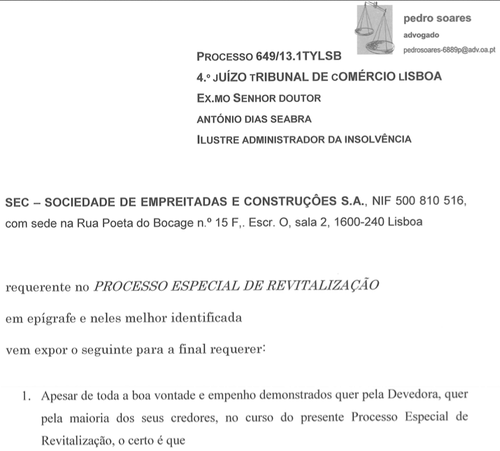 E quando tudo atingiu o chamado ponto de não retorno, eis que entra no Tribunal de Comércio de Lisboa - onde o processo corria, um pedido de insolvência da empresa - ver documento abaixo.