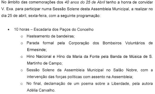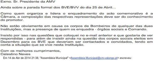 A Câmara de Valongo vai comemorar este ano de forma especial, os 40 anos da Revolução dos cravos e escolheu fazê-lo - na sede do Concelho - de uma forma parcialmente menos digna: convidou para a Parada Formal, a Corporação dos Bombeiros Voluntários de Ermesinde, que como é do conhecimento geral, enfrenta uma lamentável situação de desrespeito pela vontade maioritariamente expressa nas urnas em Dezembro de 2013 pelos seus associados. Tentando 'emendar a mão' o executivo estendeu o convite para a dita Parada Formal á Corporação da casa - os Bombeiros Voluntários de Valongo, mas isso não resolve o 'incidente' por mim suscitado - ver recortes a seguir.