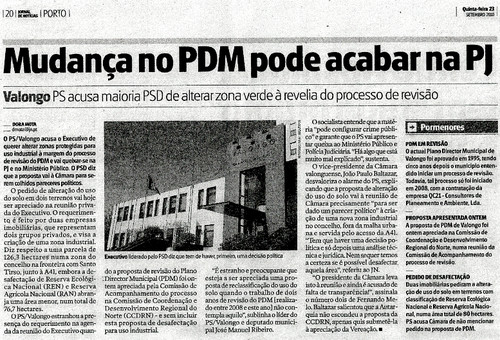 Comentário: Meu Caro, há muito que deixou de haver lugar para sonhar, estamos em tempo só de pesadelos, bem pesados, por sinal. A água de cu lavado tem muita força, tem poderes inimagináveis, e, se os mânfios do bloqueio central são useiros e vezeiros a ajustar os queixos ao bordo do penico, não há surpresas, portanto, já tal não esperava do "camarada", pelos vistos, terá emborcado, talvez, com sofreguidão, dado o provável jejum, um bom trago do líquido orgânico miraculoso. E, ainda há por aí uns incréus que não acreditam em milagres... O destino da Fonte da Prata há muito que está traçado, desde que os sonsos, todos, da vereação anterior foram responsáveis e cúmplices pelo crime ambiental da construção ilegal da Chronopost em área da REN, que funcionou como "cavalo de Tróia", com o entubamento e respectivo aterro do vale do ribeiro de Junceda. Entretanto, os terrenos de Vale de Porcos, cerca de 24 hectares, pertencentes a Água Longa, situados entre o limite com Alfena e a A41, passaram para a união das freguesias de Campo e Sobrado, há quem diga que por artes de magia de burocratas dos lados da foz do Ave, com a prestimosa colaboração dos serviços de topografia da C.M. de Valongo, com estudos técnicos, que não conseguiram explicar, apesar de solicitados. Mas, nós explicamos, tem a ver, com as Bugiadas. Conta-se que os Sobradenses andavam desgostosos com o facto de a sua monumental Igreja paroquial, de que muito se orgulham justamente, não poder ser admirada por estar situada longe da estrada, fora da vista dos passantes, decidiram, então, deslocá-la para melhor lugar, bem junto da estrada. Se assim o pensaram, rapidamente o fizeram, toca de juntar todos os novelos de lã havia, e com eles construir uma comprida e grossa corda capaz de envolver a Igreja e atrelar todas as juntas de bois da freguesia. Pelos relatos que ouvimos a pessoas mais antigas, inicialmente acreditaram que a Igreja se deslocou logo aos primeiros impulsos das juntas de bois e até pararam para festejar o feito, espalhafatosamente, à boa maneira de Sobrado. Reiniciada a operação, breve constataram, para tristeza de todos, que aquilo que pensaram ter sido a deslocação da Igreja não fora senão o esticar da corda, devido à elasticidade da lã . Operação falhada, portanto, a Igreja de Sobrado continua e muito bem, no exacto local onde foi há séculos construída. Falhada, porem, não foi esta operação de arrastar os 24 hectares de terrenos de Vale de Porcos, de Água Longa para o lugar de "Sobrado da freguesia de Sobrado", desta feita, sem cordas de lã nem juntas de bois. Uns, juram que o fracasso da operação da Igreja se deveu à falta de lubrificação, ao contrário desta, onde foram devidamente aplicados os lubrificantes mais eficazes, nas bolsas (de óleo) certas. Outros, talvez por razões toponímicas, afirmam, sem quaisquer dúvidas, que se trata de negócios (de) porcos. Vá-se lá saber quem tem razão. Tem alguma razão meu Caro, a vida não pode ser só pesadelos, tem de haver lugar para os sonhos. Vamos fazer por isso.