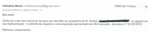 E dou um exemplo do que afirmo - ver recorte a seguir - uma situação de aparente favorecimento ilícito por parte dos Serviços, que transita do mandato anterior - não é isso que está em causa - e em que um cidadão de Ermesinde que se sente prejudicado expôs o problema à Câmara. Por entender que na resposta que lhe enviaram não lhe foi feita justiça, pretende falar com o presidente.